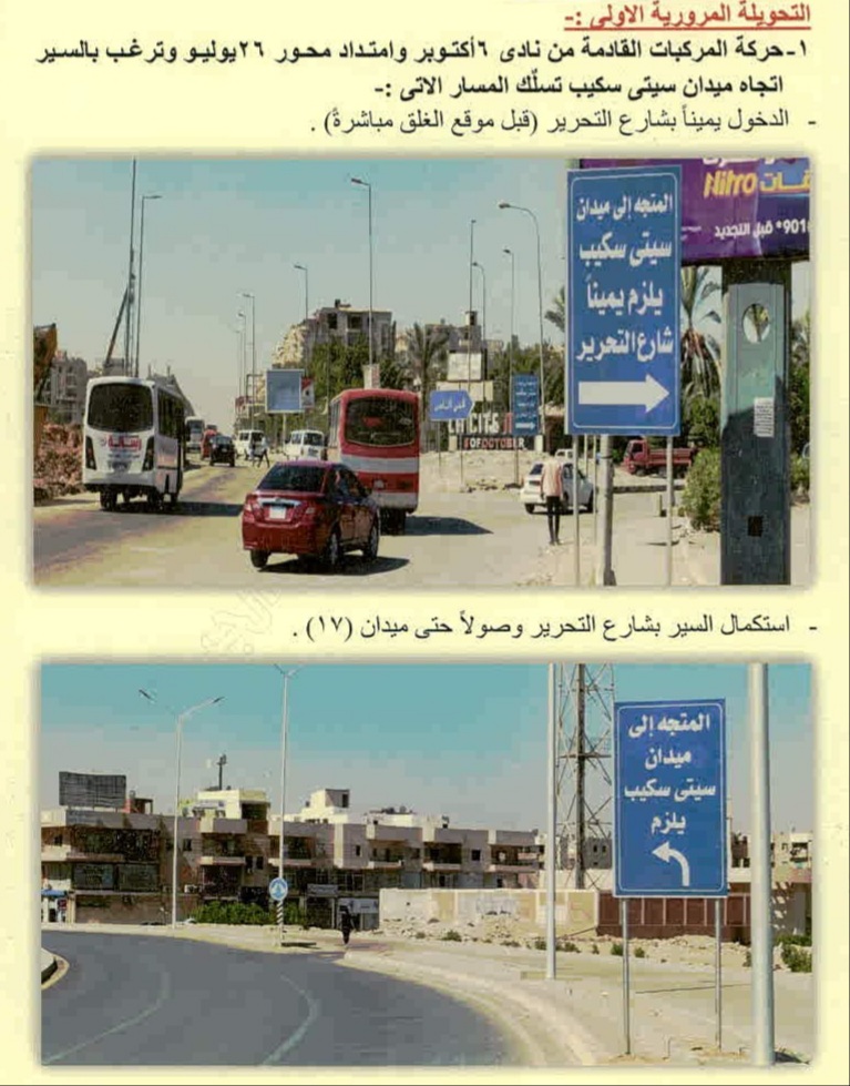 •حركة المركبات القادمة من نادى 6 اكتوبر وامتداد محور 26 يوليو وترغب بالسير اتجاه ميدان سيتي سكيب تسلك المسار الاتي ـ: